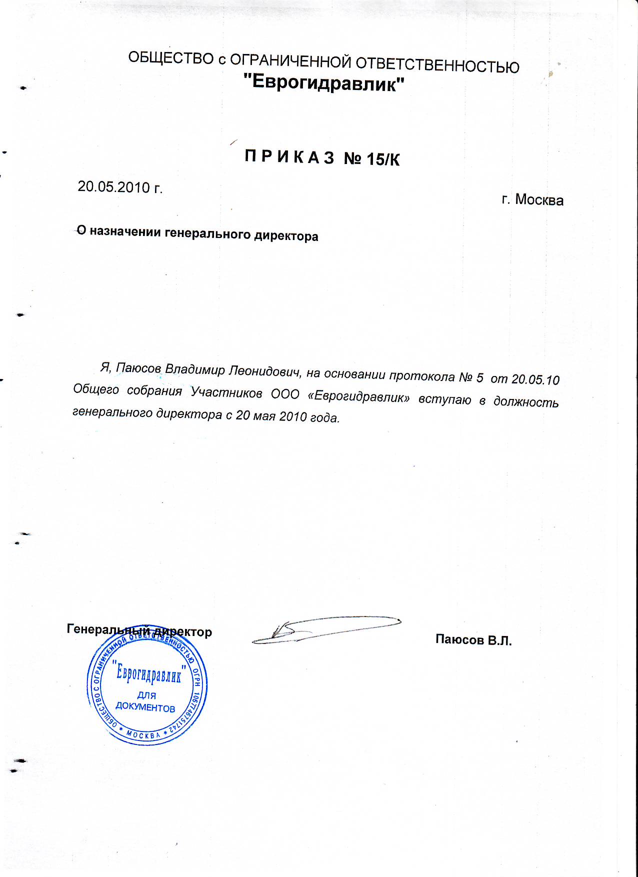 Приказ о назначении генерального директора